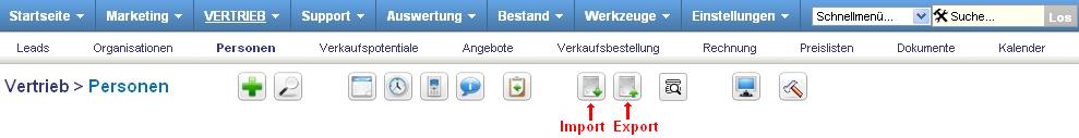 Wie in der Abbildung: Personen Import und Export Icons beispielhaft zu sehen, finden Sie oberhalb der Liste die Import und Export Werkzeuge.