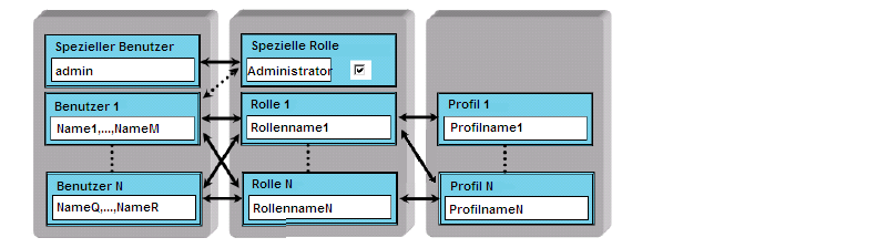 Die Beziehungen zwischen Nutzern, Rollen und Profilen ist in der Abbildung: Beziehungen zwischen Benutzer, Rollen und Profile dargestellt. Wie zu sehen ist, sind diese Beziehungen vielfältig miteinander verknüpft. So kann z.B. eine Person über mehrere Logins verschiedene Rollen innehaben, eine Rolle wiederum kann mehreren Nutzern zugewiesen werden. Rollen können für verschiedene Arbeitsaufgaben im Unternehmen stehen. So kann z.B. eine vertriebsbezogene Rolle zu einem Vertriebsmitarbeiter und eine andere Rolle zu seinem Assistenten definiert werden.